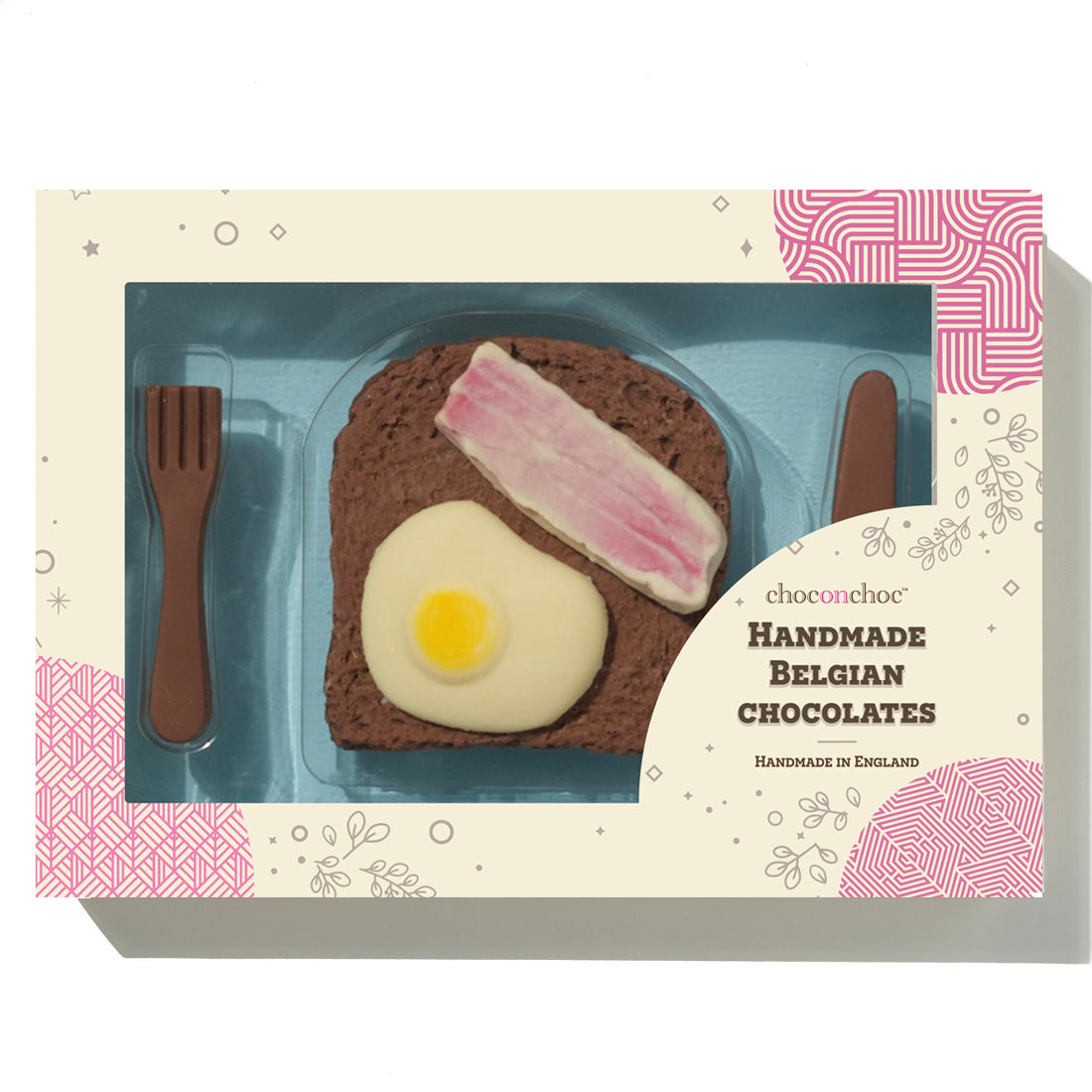 - Box contains one chocolate slice of toast topped with chocolate egg and bacon and a chocolate knife and fork