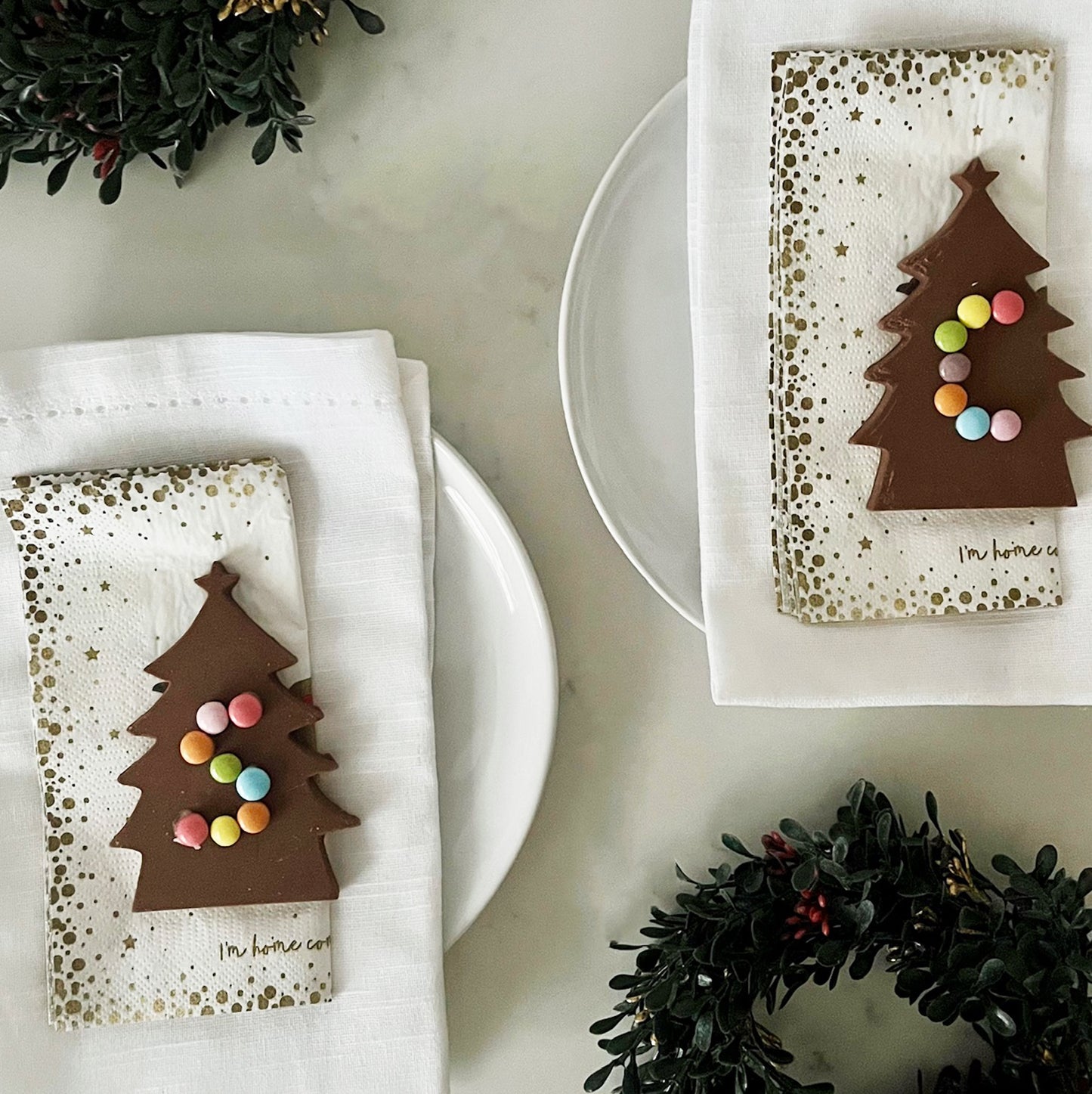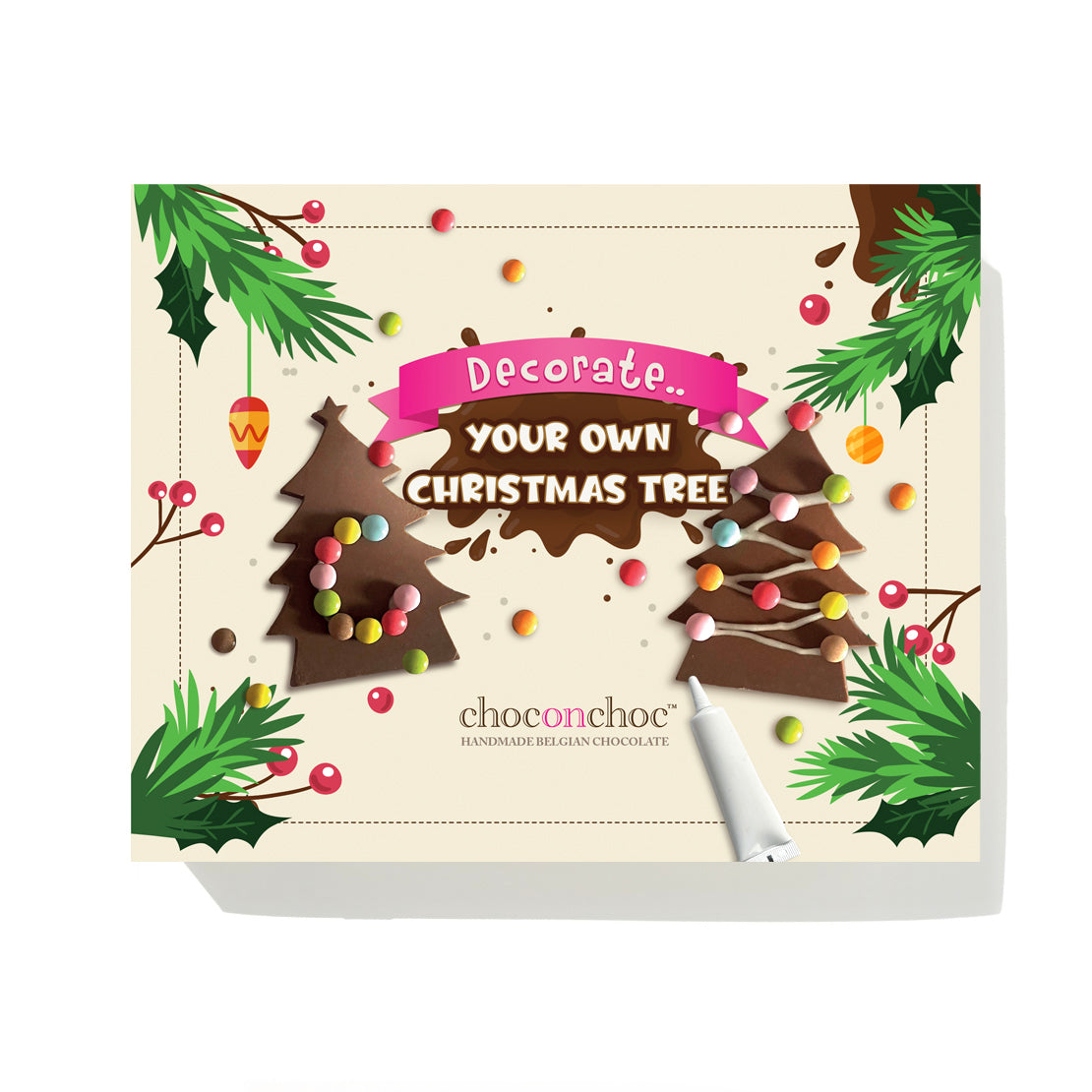 - Box contains 4 x interlocking chocolate tree pieces, 1 x icing pen, 1 x bag of mini smarties