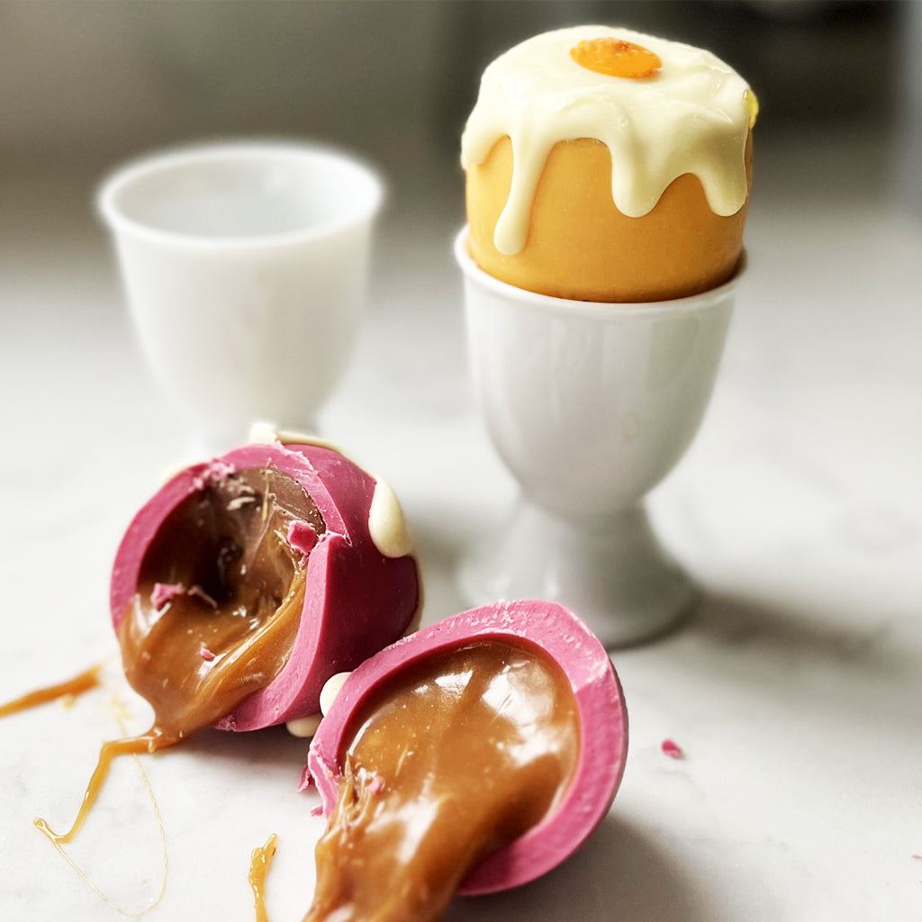 - Box contains two life-size chocolate eggs filled with Caramel Sauce