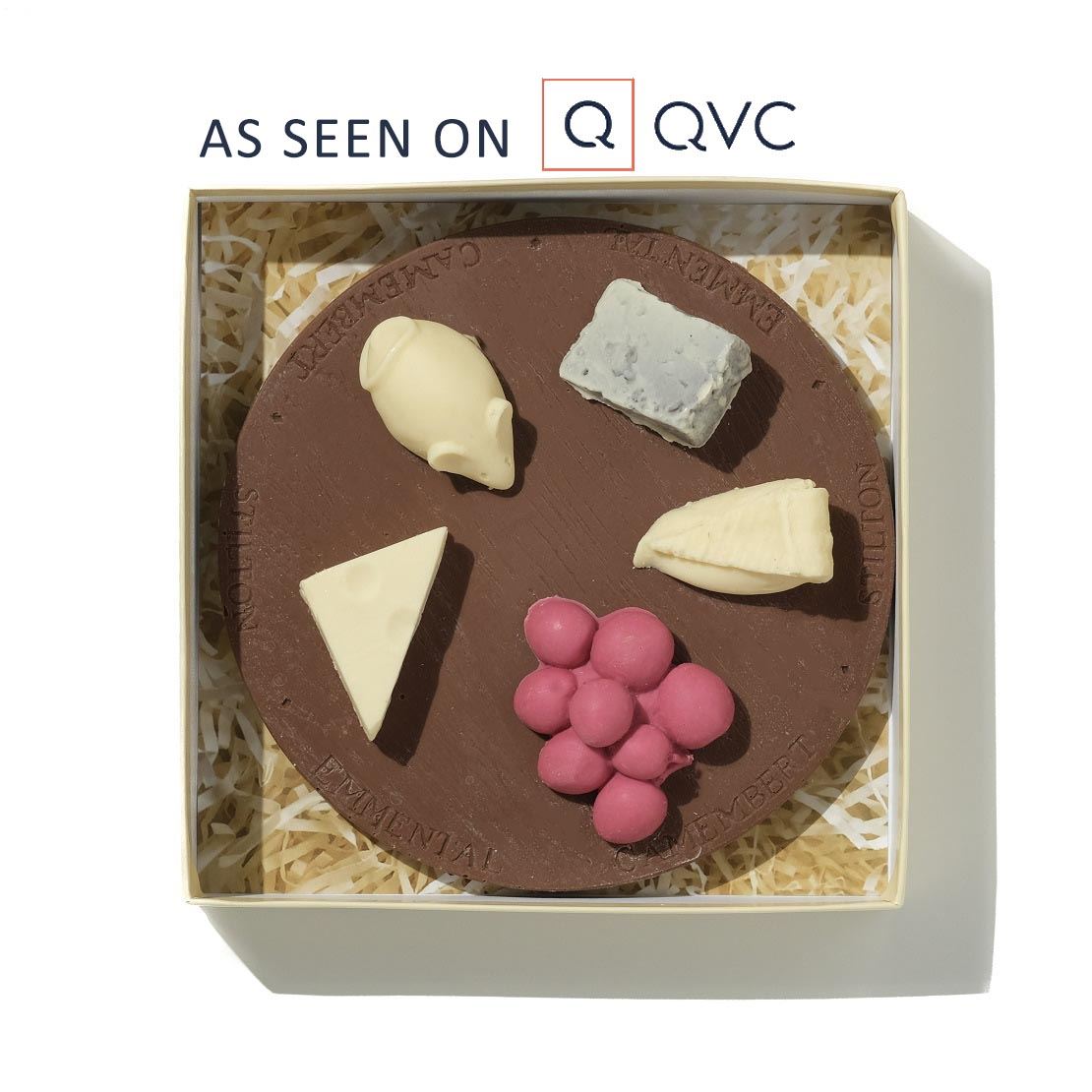 - Box contains novelty milk chocolate cheeseboard, white chocolate grapes